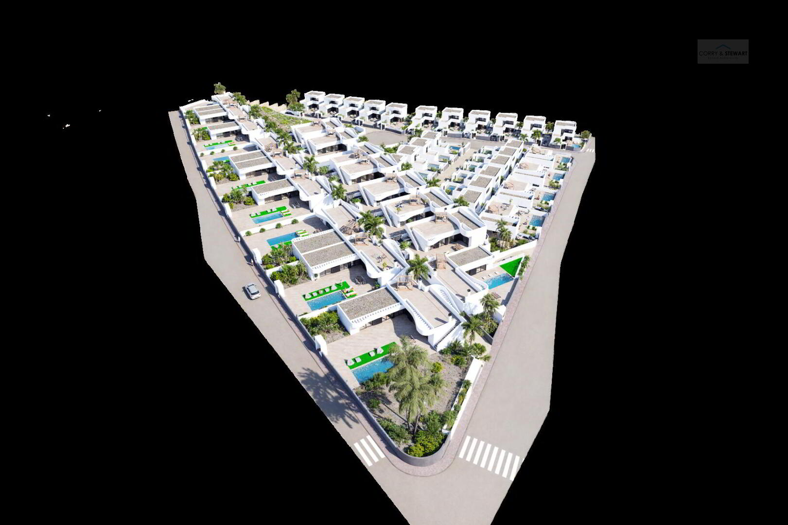 This particular villa is over two levels and boasts a luxurious garden with a 6 x 3m private swimming pool. There is the optional extra of adding a basement level to this villa design on certain plots. The interior layout comprises of an entrance hallway leading to the bright and spacious open plan lounge and dining area with large corner windows creating plenty of natural light as well as opening onto the terrace. Within the main living space is a fully fitted modern American style kitchen with low and high cupboards and a centre island. The ground floor also includes a double bedroom with patio door access onto the main terrace area, and there is also a separate guest bathroom. The interior staircase leads you up to the first floor level with the Primary bedroom with en-suite bathroom, and there is another good sized double bedroom. The first floor has access to a lovely sun terrace overlooking the private garden and pool. The properties come including pre-installation for air conditioning, built in wardrobes with drawer units in all bedrooms, interior and exterior LED lighting, an optional domotic system, garden finished with paved areas, artificial grass with available space for landscaping, and private parking on the plot.