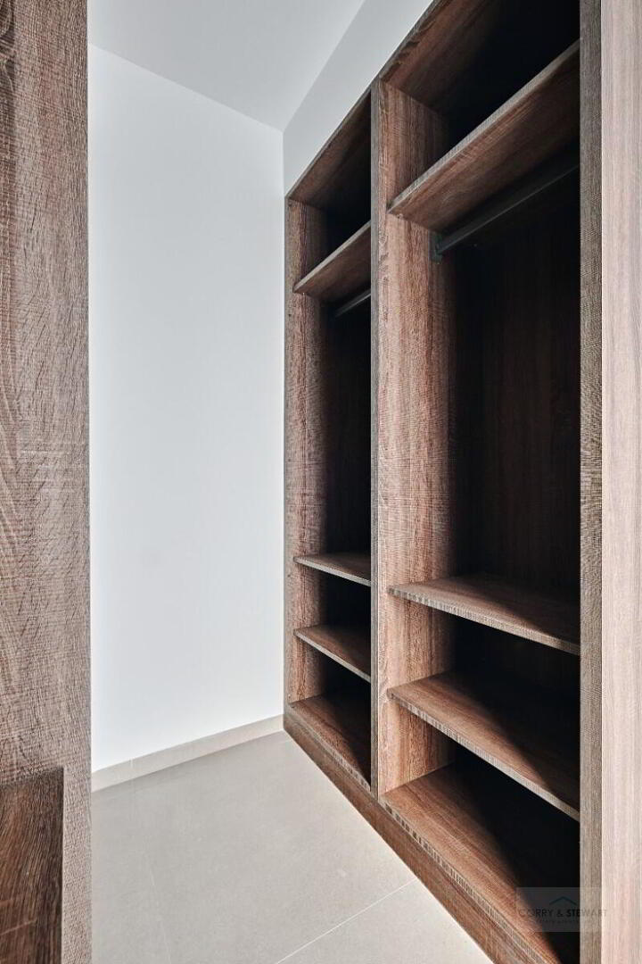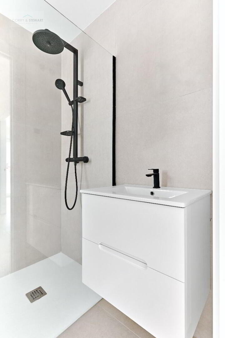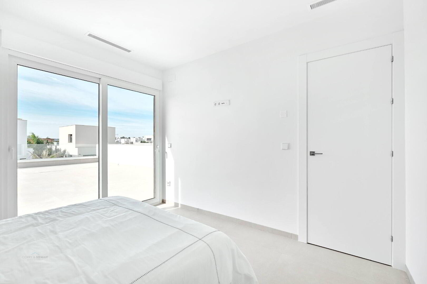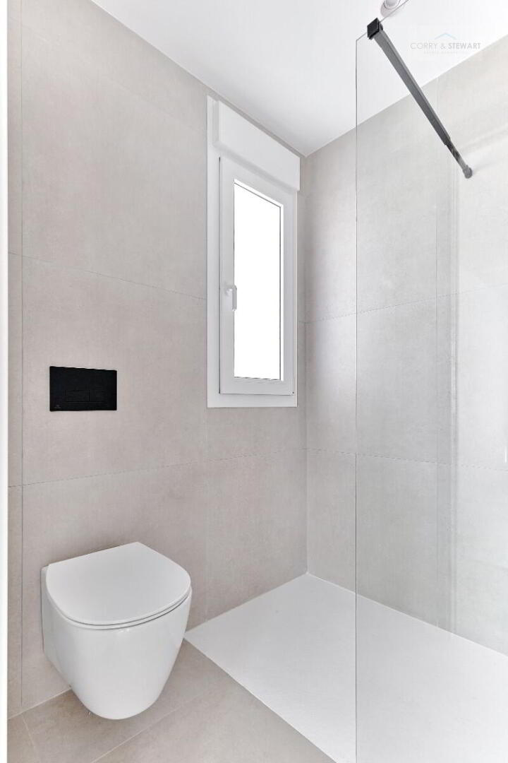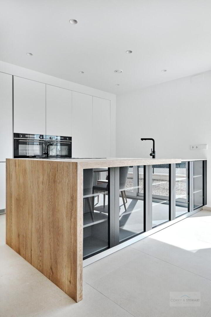 This particular model villa is over two levels and the interior layout comprises of an entrance hallway leading to the bright and spacious open plan lounge and dining area with large windows throughout creating plenty of natural light to flow through the property as well as opening onto the terrace and garden. Within the main living space is a fully fitted American style kitchen with centre island offering a choice of colours, there is a separate laundry room and guest toilet. The ground floor level also includes the impressive Primary suite with large bedroom, en-suite bathroom and walk in wardrobe / dressing area. The interior staircase leads you to the first floor level with a further two good sized double bedrooms and a separate guest bathroom. The first floor level boasts a 58m2 solarium with beautiful open views, perfect to enjoy the sun all day long. All villas come including ducted air conditioning, kitchen electrical appliances, underfloor heating in the bathrooms, built in wardrobes in all bedrooms, interior and exterior LED lighting, private swimming pool and private parking on the plot.