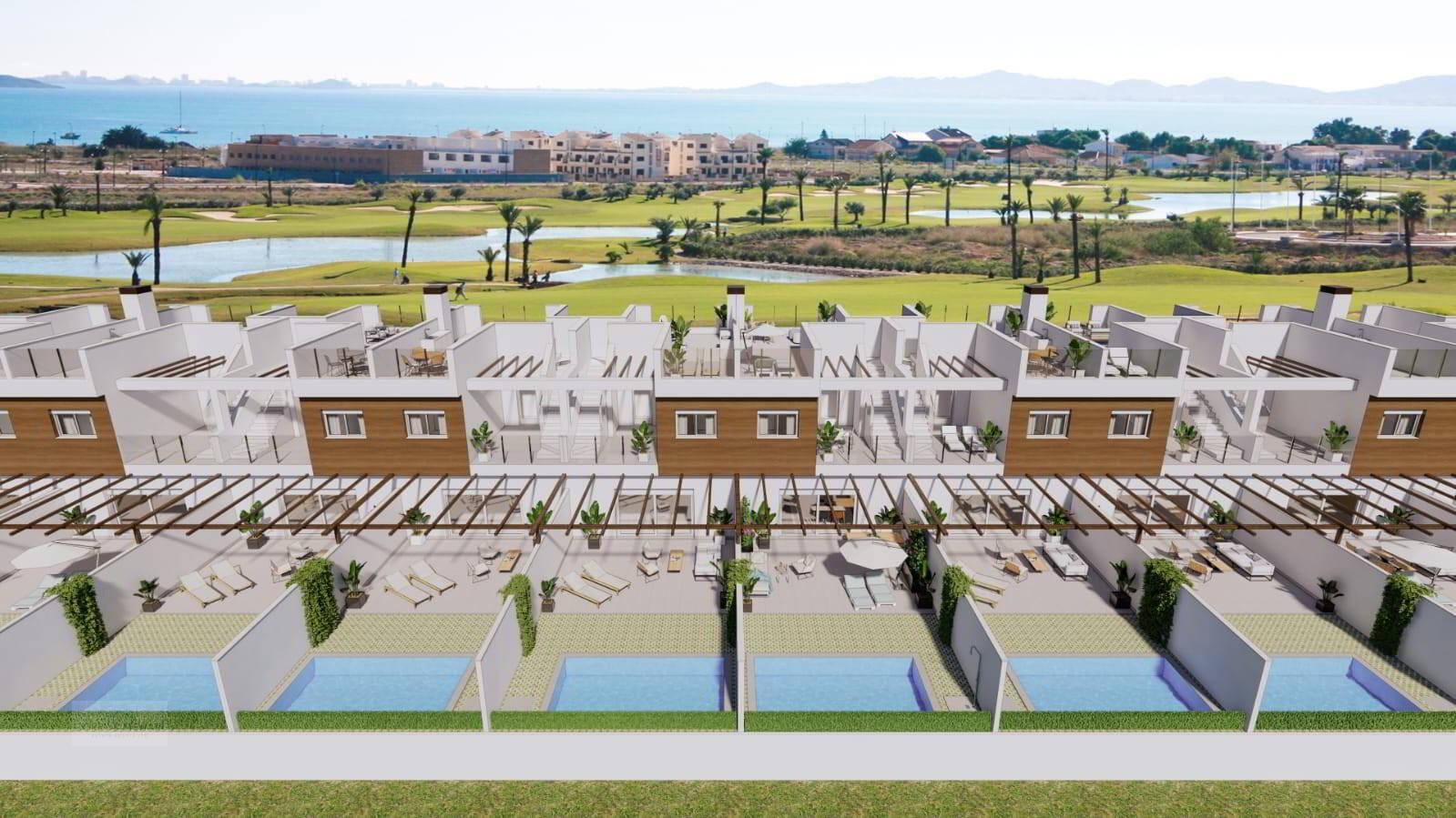 The project combines a contemporary design with exceptional quality and functionality. The properties boast large terraces and a rooftop solarium, with East and West orientations on their main facades. The houses are made up of three floors, a private garage, a ground floor, and a first floor. They are located in an unbeatable environment, a few metres from the Mar Menor, and surrounded by the La Serena golf course, in Los Alcazares.