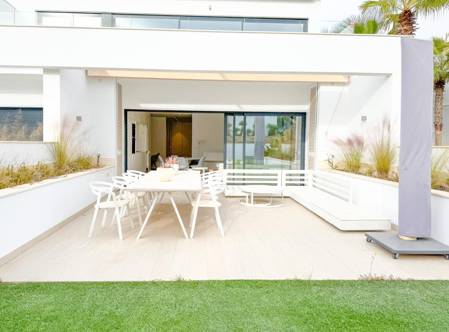The interior has been designed with a luxurious finish with top quality equipment. The layout comprises of an entrance hallway leading to the bright and spacious open plan lounge and dining area with large windows overlooking and opening on to the terrace and garden. Within the main living space is a fully equipped American style kitchen finished in white with a sleek design feature where the food preparation area can be fully enclosed when not in use. The large Primary bedroom includes an en-suite bathroom with feature rain shower, built in wardrobes, and also has patio door access on to the main terrace. There are a further two good sized double bedrooms overlooking the green landscape at the rear of the property, both bedrooms including built in wardrobes, and there is a separate guest bathroom with a rain shower. The property has been tastefully designed and decorated with neutral tones including light wood coloured tiles throughout the entire apartment that extend to the terrace which brings the interior and exterior spaces into one. The property is being sold fully furnished, and includes full installation of air conditioning, underfloor heating in both bathrooms, Home automation system with Domotica, electric interior blinds, and private underground parking with storage room.